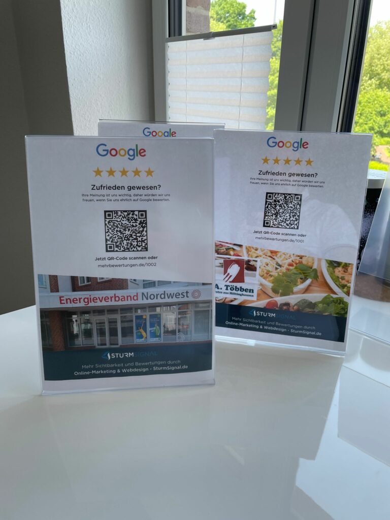 Damit der Aufsteller auch definitiv auffällt, erstellen wir Ihren persönlichen Aufsteller mit ansprechenden Bildern und Ihrem Logo oder etwas, das Ihr Unternehmen repräsentiert und erstellen Ihre ganz persönliche Bewertungsseite in unserem System ein.